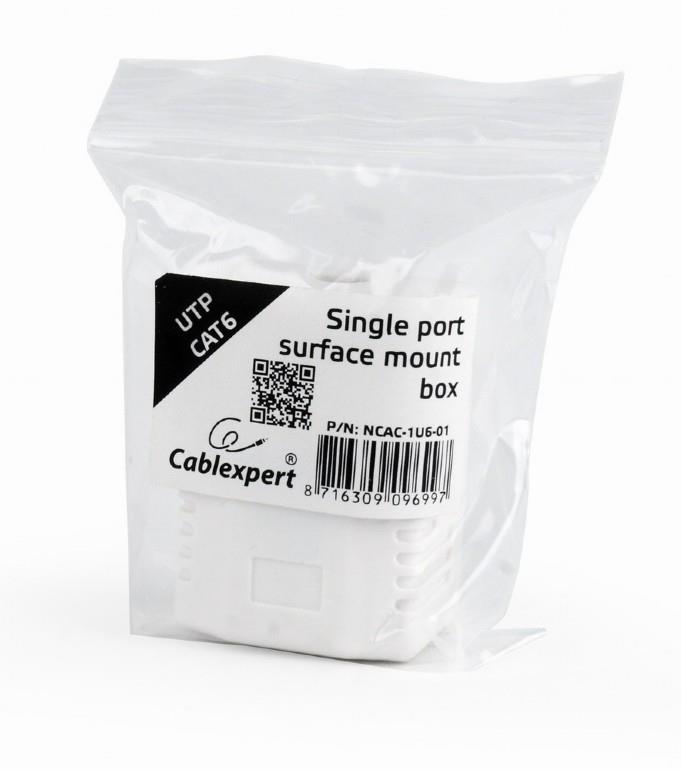 Single port surface mount box assembled with keystone jackIncludes mounting screws, adhesive tape Category: 1x RJ-45 8P8C/UTP CAT6/KRONEShielding: no, UTPDimensions: 53 x 40 x 30 mmNet weight: 30 gColor: white