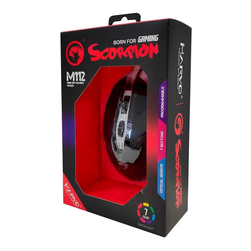Το ποντίκι διαθέτει 7 πλήκτρα, με 2 κουμπιά στο πλάι για την ευκολή πλοήγηση σε διάφορες εφαρμογές. Έχει ματ επιφάνεια με αντιολισθητικό φινίρισμα για καλύτερο κράτημα και ακρίβεια κατά τη χρήση. Η ευαισθησία του αισθητήρα DPI μπορεί να ρυθμιστεί σε τρία επίπεδα (800-1600-2400-4000) για ευκολία στη χρήση. Το ποντίκι συνδέεται με τον υπολογιστή μέσω USB καλωδίου και υποστηρίζει λειτουργία Plug and Play, χωρίς την ανάγκη οδηγού εγκατάστασης. Επιπλέον διαθέτει RGB φωτισμό για εντυπωσιακή εμφάνιση. Συνολικά, το Marvo M112 είναι ένα προσιτό gaming ποντίκι με αξιοπρεπείς επιδόσεις και λειτουργίες για τους casual gamers.SpecificationsSensor: Optical, Marvo 8812DPI: 800-1600-2400-4000Buttons: 7 (programmable)Switch rating: 3 million clicksBacklight: 7 colorsInterface: USB 2.0Cable length: 1.5 mOS support: Windows 7 or newerFeatureHigh-profile design with full palm supportEnhanced control for palm and claw grip stylesRubber scroll wheel for enhanced feel7-color backlight with breathing effect